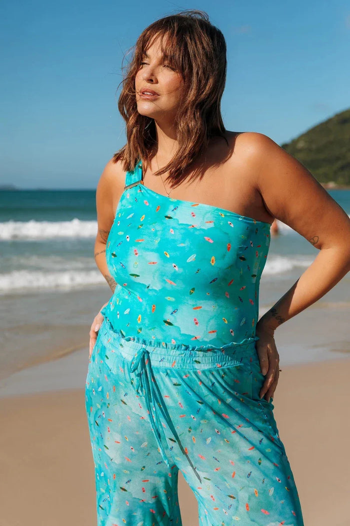 A Calça Daniella é uma saída de praia com cintura alta, cós de elástico, amarração na frente, e comprimento longo. Pode ser usada como saída de praia e também para...