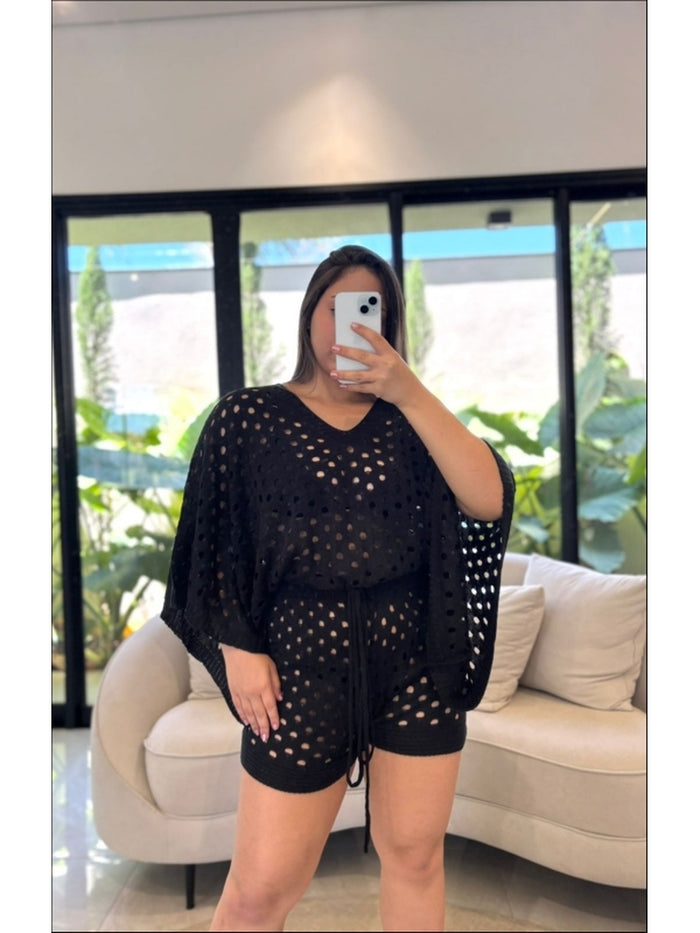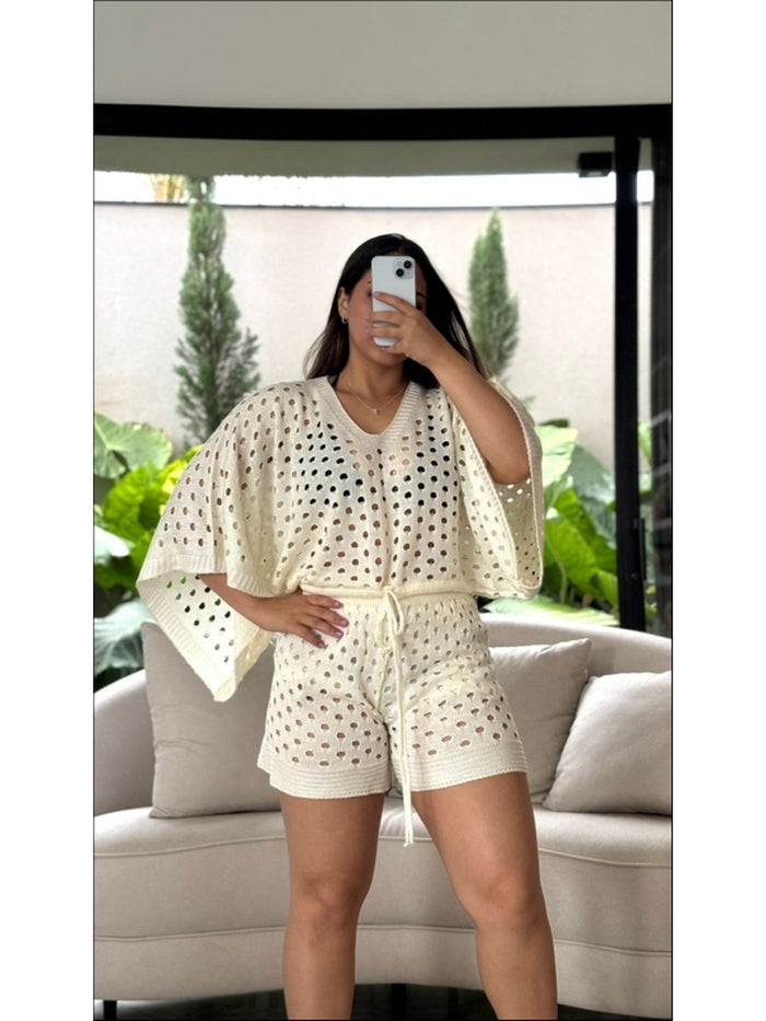 Conjunto Short Luana com blusa e short em tricô vazado, perfeito para dias quentes. Design moderno, tecido leve e respirável que une conforto e elegância para seu look casual e sofisticado.